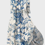 Тази прекрасна дълга рокля на бял фон с син цветен десен излъчва свежест и елегантност. Нейният ефирен дизайн създава романтична атмосфера, докато коланът в талията естествено и женствено подчертава силуета.