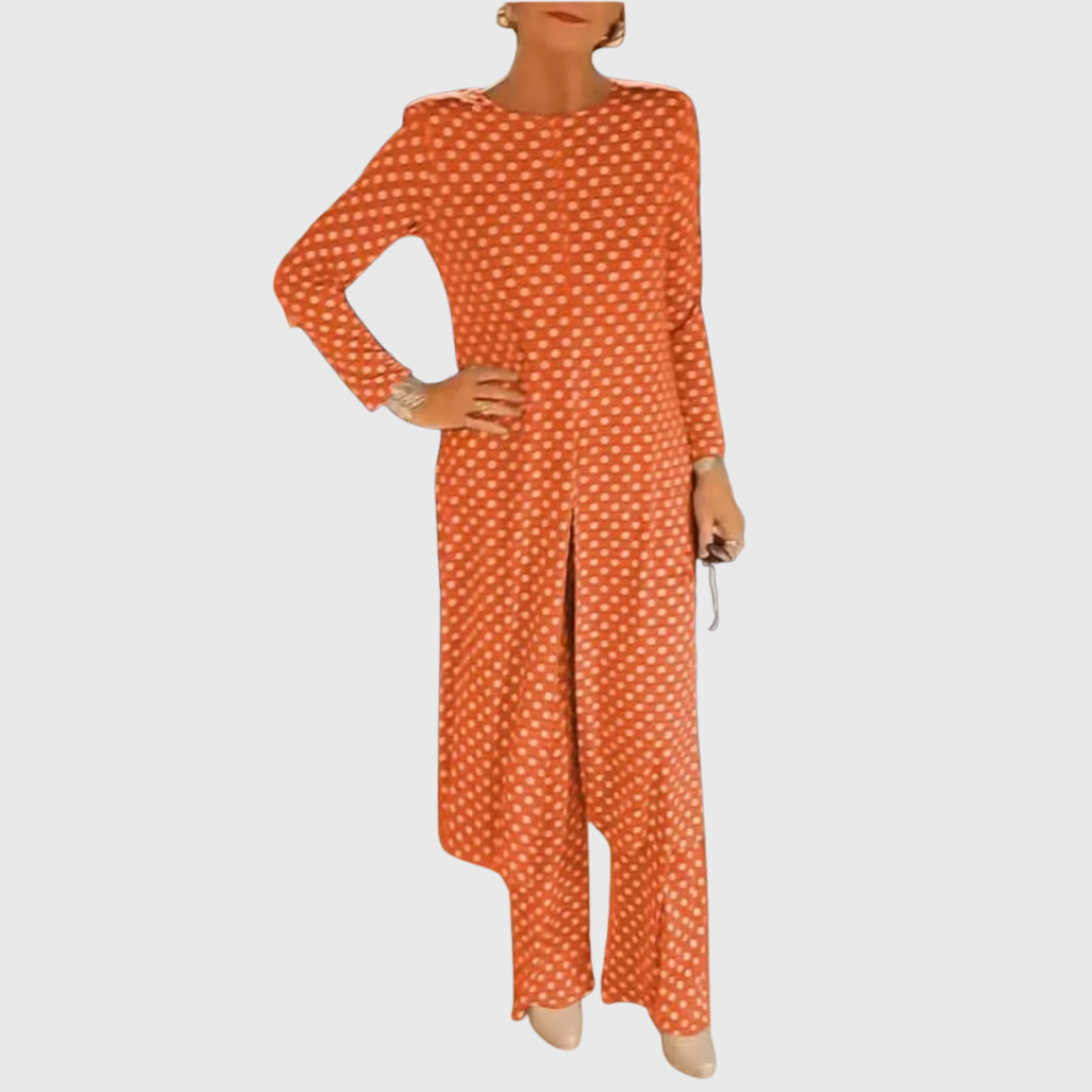 Този елегантен черно-бял комбинезон на точки съчетава ретро чар и съвременен комфорт. Дългите ръкави и ефирният силует го правят перфектен избор за дневни и вечерни поводи. Независимо дали го носите с обувки на ток за изискан вид или с балеринки за неформален вариант, този модел осигурява стил и комфорт едновременно.