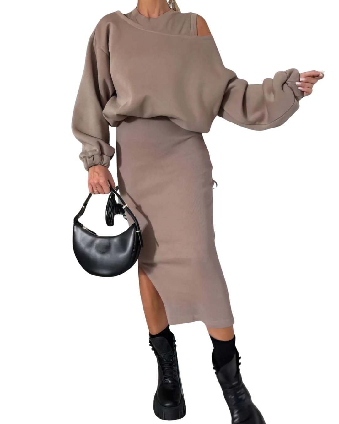 Изработен от мека и еластична материя, комплектът е идеален за неформални и елегантни поводи. С минималистичен дизайн, той е универсален избор за ежедневието.