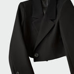 Минималистичен кратък сако с елегантен дизайн и модерни детайли. Яката с остри линии и предното закопчаване придават динамичен характер, докато краткият крой го прави идеален за стилни появления. Лесно се носи в бизнес, но и вечерни поводи.